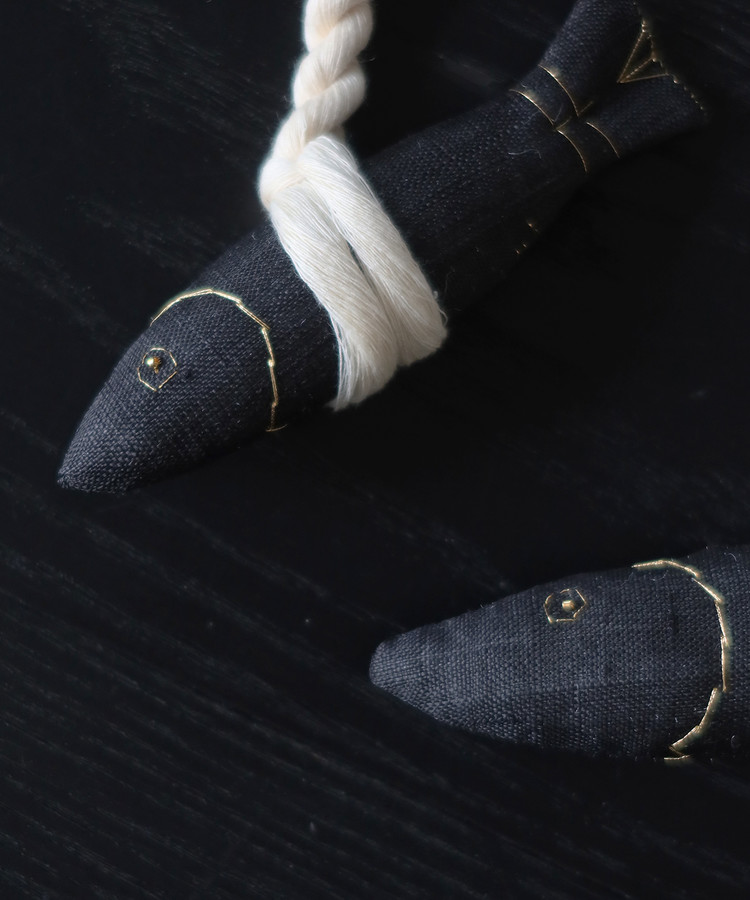 choiheeju 최희주 ㅣ이예하에서 소개하는 최희주 작가의 <검정 모시 명태>는 깊고 차분한 검정 모시를 배경으로 반짝이는 금사 수를 놓아 보호와 축복의 빛이 어둠 속에서 더욱 선명하게 빛나는 듯한 느낌을 줍니다.