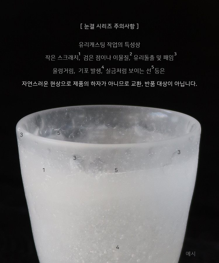 - 눈결 시리즈의 유리 공예품은 작은 스크래치, 검은 이물질, 유리돌출 및 패임, 울렁거림, 기포 발생 등의 자연스러운 현상이 있습니다. 이는 제품의 하자가 아니므로 이로 인한 교환, 반품은 어렵습니다.