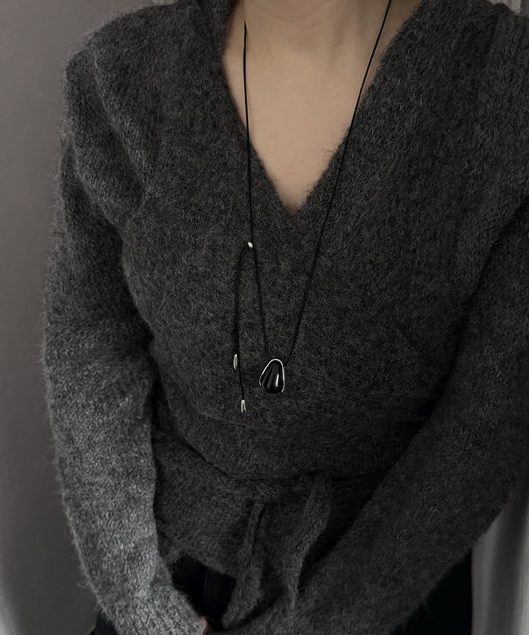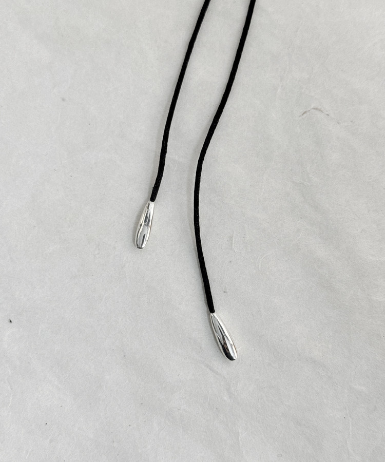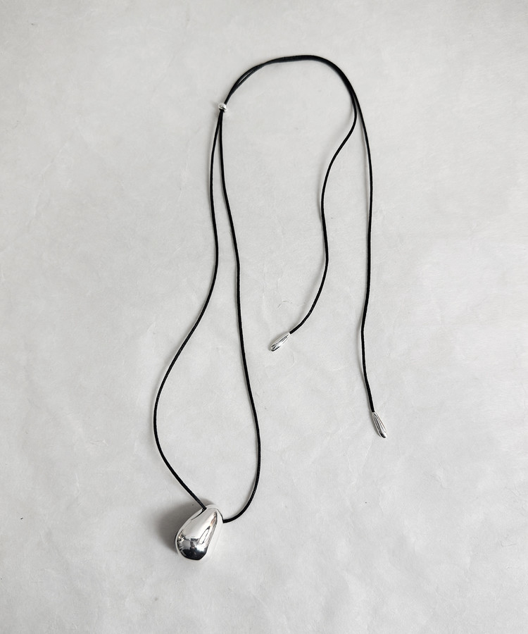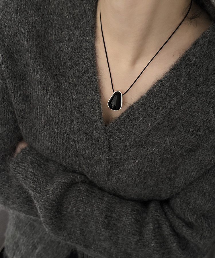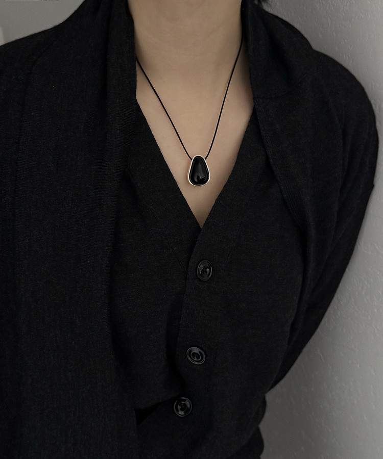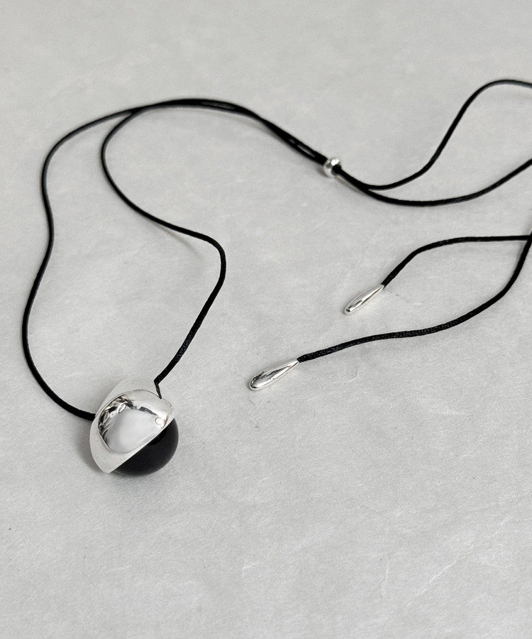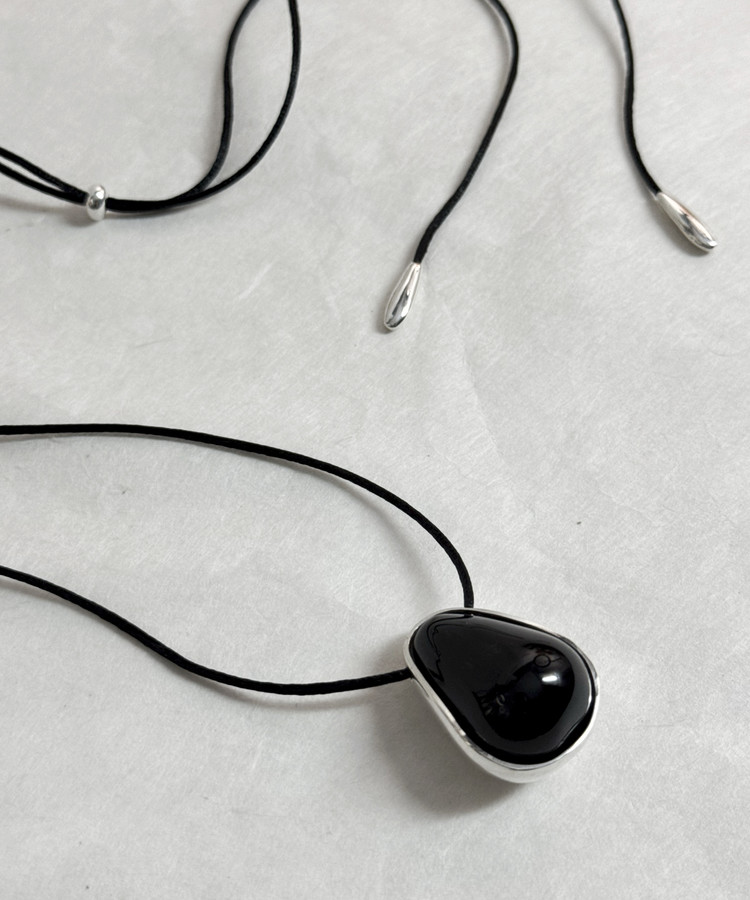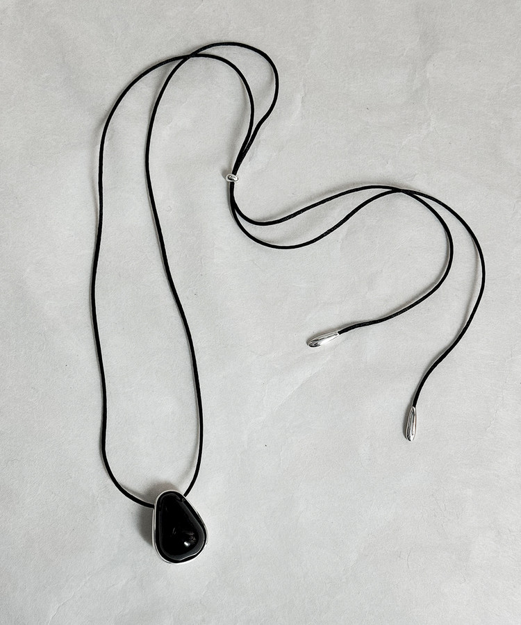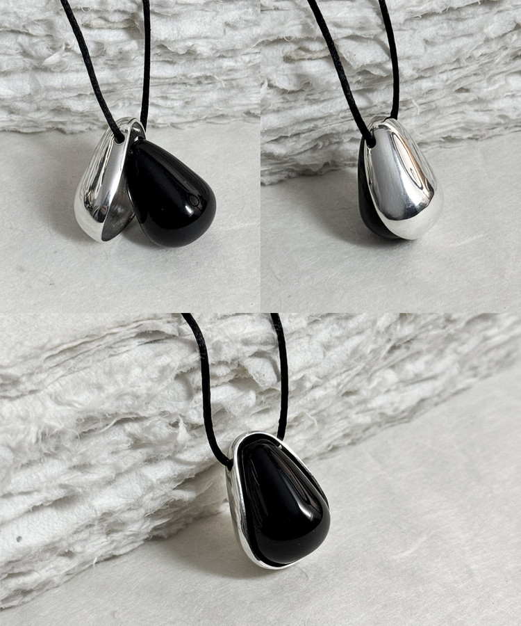 검고 차분한 광택의 오닉스를 은으로 반쯤 감싸 만든 목걸이입니다.